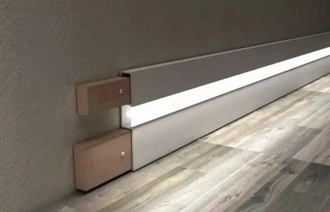 直接在踢腳線上開燈槽,將燈帶鑲進燈槽也是可以的。利用立面完成面的下邊沿擋住視線形成視覺死角,也可以達到看不到LED燈帶的效果