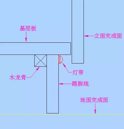 在基底層板上直接安裝一條LED燈帶,地腳線向墻里側(cè)退一定距離,立面完成面的下端凸出基層底板一定距離,尺寸以剛好遮住LED燈帶為準(zhǔn)。